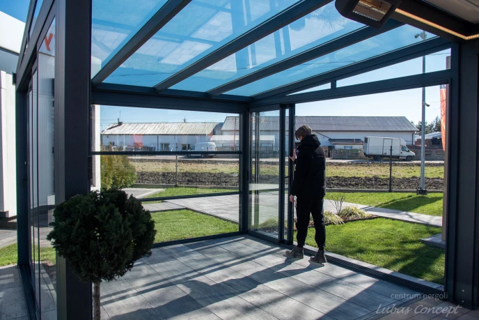 System gilotyna w pergolach to nowoczesny mechanizm, który pozwala na pionowe wsuwanie i wysuwanie szyb, umożliwiając szczelne zamknięcie bocznych przestrzeni pergoli. Po opuszczeniu szyb tworzy się forma barierki lub balkonu, co jest idealne dla projektów restauracyjnych czy hotelowych. System ten oferuje elastyczność w użytkowaniu, umożliwiając opuszczanie szyb z góry na dół i zatrzymywanie ich w dowolnej pozycji. W ciepłe dni można otworzyć szyby, ciesząc się przestrzenią na świeżym powietrzu, a w niepogodę - stworzyć zadaszone, osłonięte miejsce. Możliwość montażu promienników ciepła zapewnia komfort użytkowania pergoli również w chłodniejsze dni.