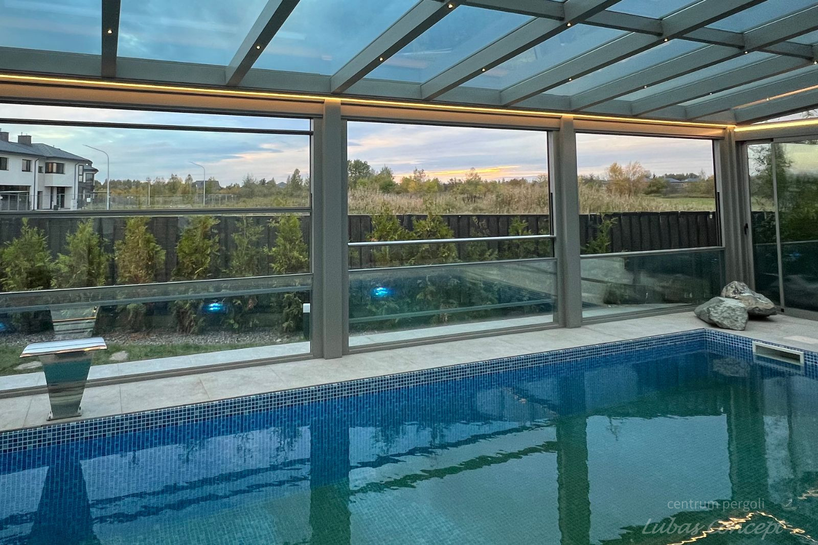 Moduł szklany w tym systemie pracuje w pełni automatycznie. Stosujemy pakiet szkła zespolonego o grubości 20 mm (4/12/4). Poruszają się one pionowo w trzech prowadnicach bocznych. Ruch szyb w górę i w dół jest możliwy dzięki zbrojonym pasom napędowym oraz silnikowi Somfy. Tak wzmocniony system gwarantuje płynny i stabilny